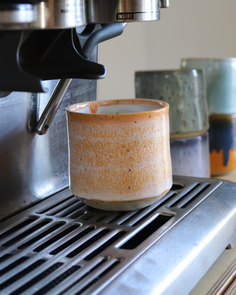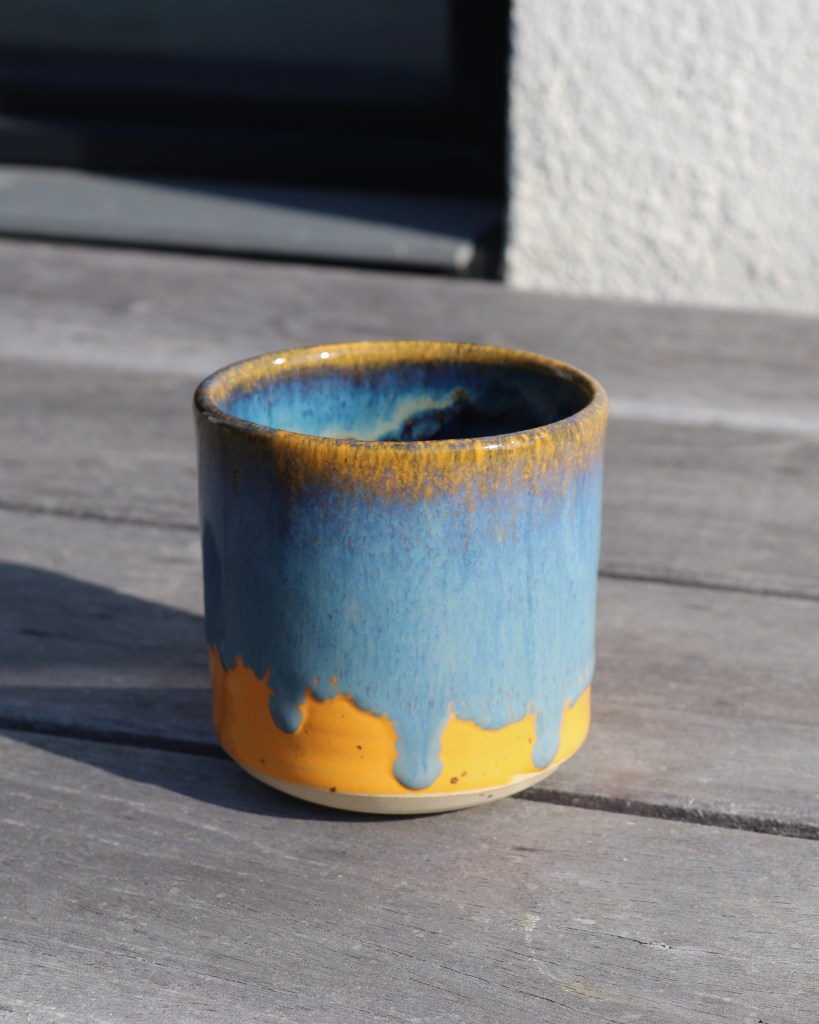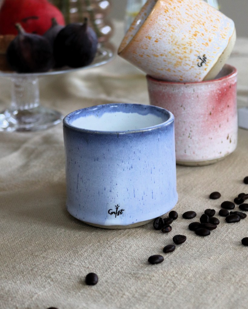 Hånddrejede keramik kopper i stentøj, så de kan holde til hverdagens strabadser, opvaskemaskine og mikro-ovn. Glaserede i et hav af fine farver – et farverigt pust til kopreolen!