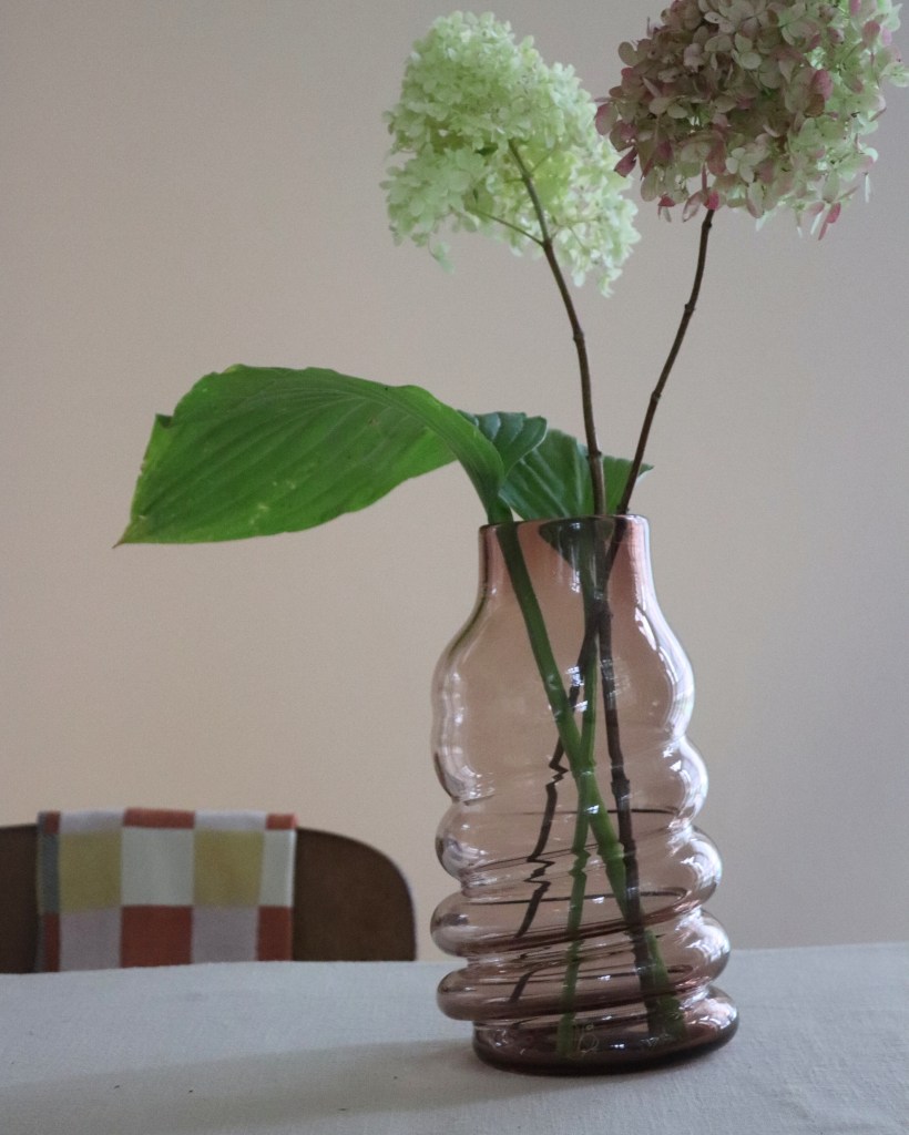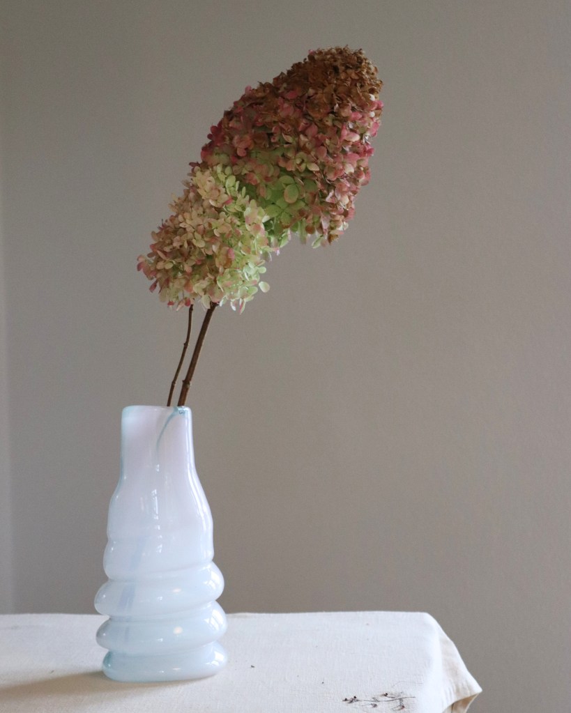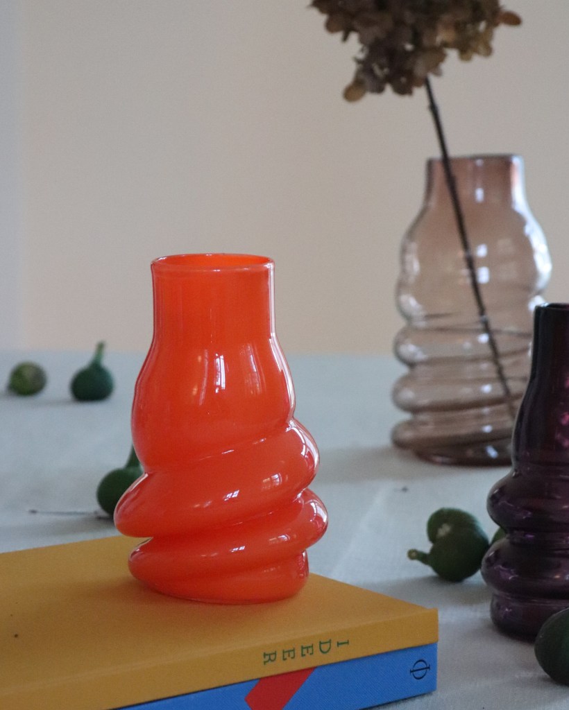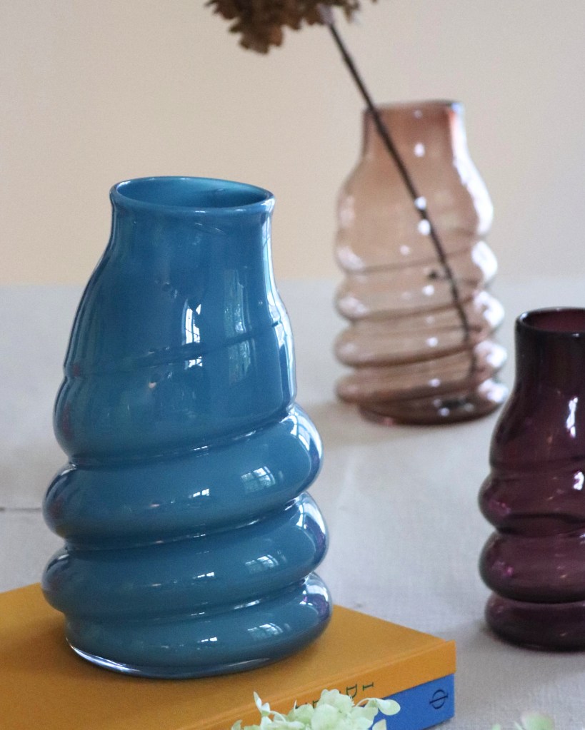 Mundblæst glasvase fra Glaspusteriet Gnist ved Skive Fjord. De svungne former fanger og leger med lyset på fineste vis. God til enkelte stilke eller buketter. Glasset pustes op i en stål fjeder, heraf navnet “fjedervase” og den gentagne drejede form. De pustes i mange forskellige farver og to størrelser.